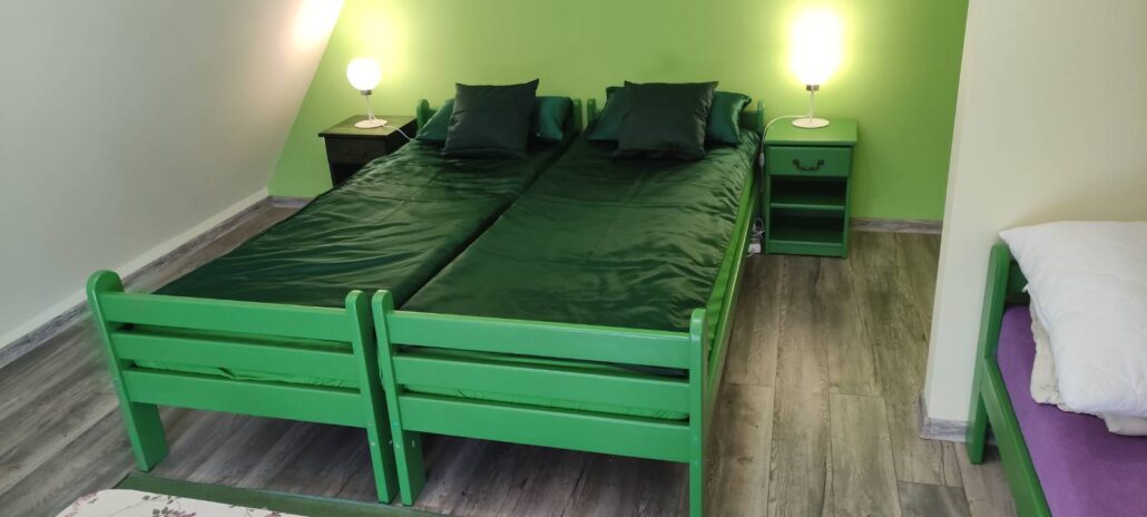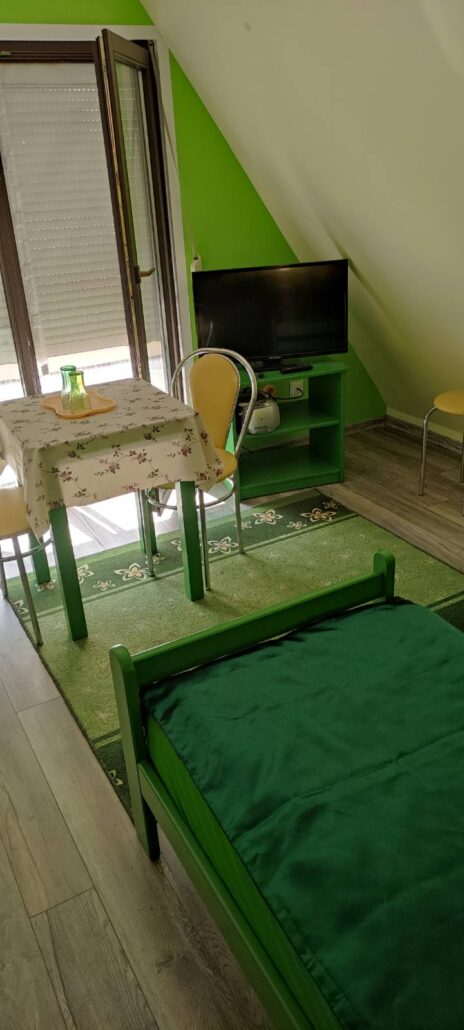 Pokój 2- 3 osobowy . W pokoju łóżko małżeńskie i pojedyncze, lub 3 łóżka pojedyncze. Pokój wyposażony w stół i krzesła. Stoliki nocne przy łózkach, stolik RTV. W pokoju także telewizor 32, odtwarzacz płyt CD, magnetofon kasetowy. Łazienka poza pokojem, osobna dla każdego pokoju. Każdy pokój ma do dyspozycji dużą i przestronną szafę ubraniową. Własny balkon oraz taras ogólny dla klientów zamieszkałych na piętrze. W bezpośrednim sąsiedztwie pokoju kącik kulinarny a w nim lodówka, płyta indukcyjna, czajnik, naczynia, sztućce.